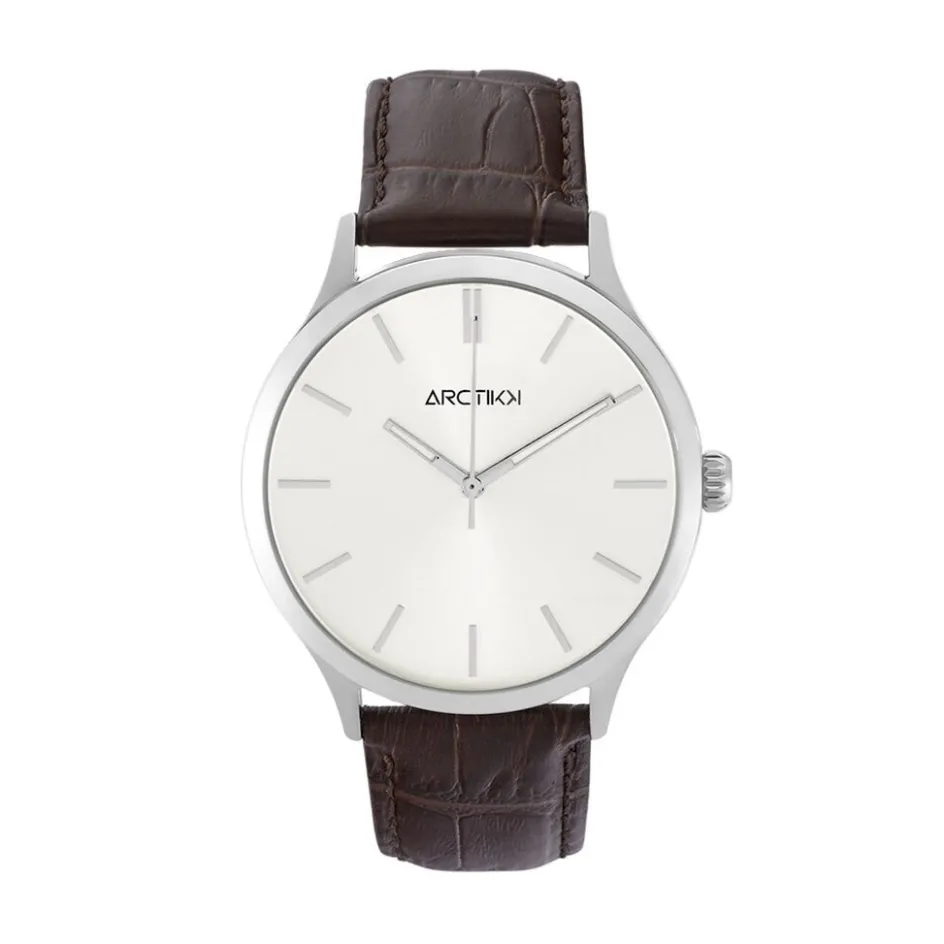 Montre Arctik Micro Alliage Argenté Ronde Quartz 40mm Fond Argenté Bracelet Cuir Vache Effet Alligator Marron P100988-c