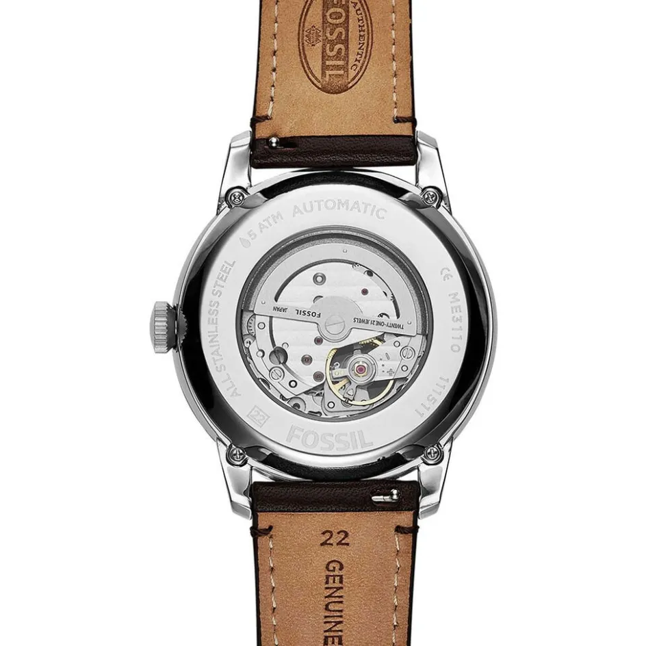 Montre Fossil Townsman Acier Blanc Ronde Automatique 44mm Fond Bleu Bracelet Cuir Brun Me3110