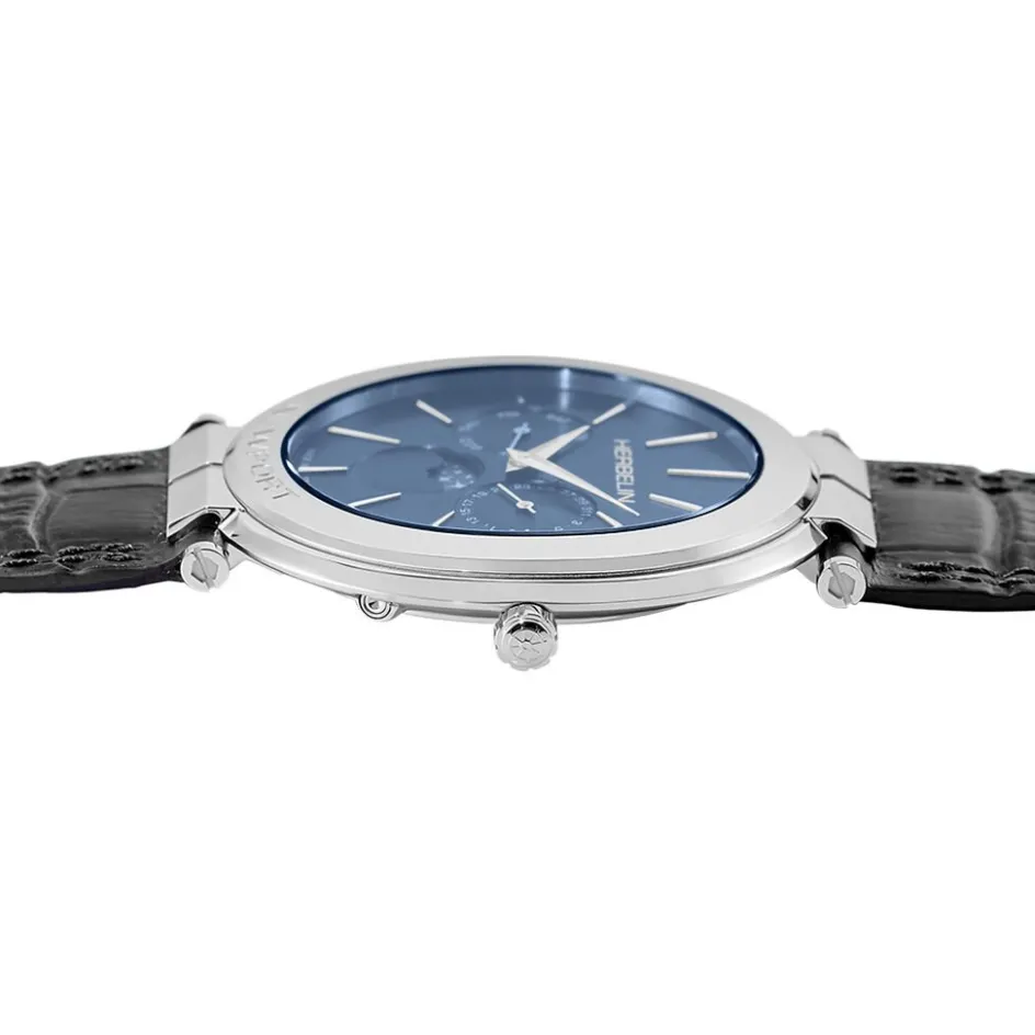 Montre Herbelin Newport Slim Acier Argente Ronde Quartz 41.5mm Fond Bleu Bracelet Cuir De Vachette Noir 12722ap15