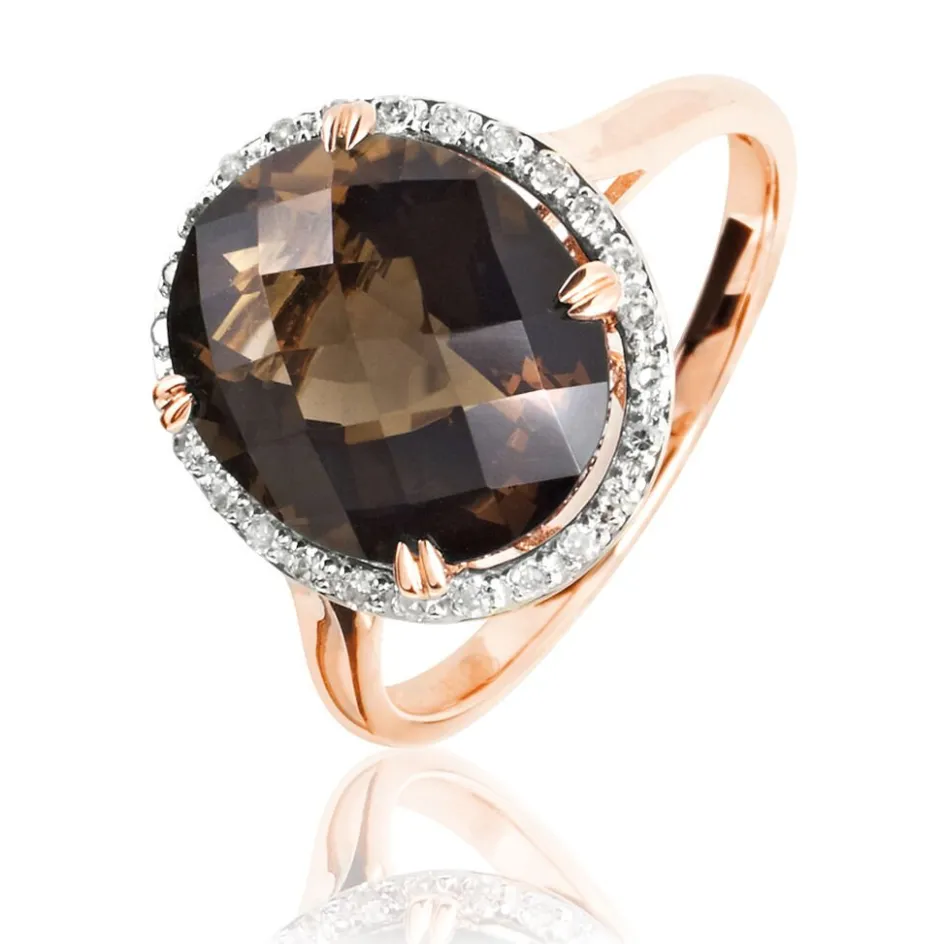 Bague Or Rose 375/1000 Quartz Fume Ovale Entourage Diamants