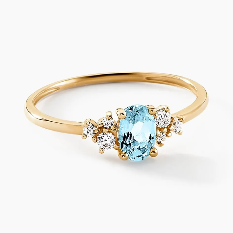Bague Or Jaune Solitaire Accompagne 375/1000 Topaze Bleu Sky Ovale 0.46cts Serti Griffes Et Oxyde De Zirconium
