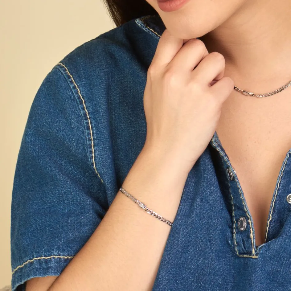 Bracelet Argent 925/1000 nexus Oxyde De Zirconium Rectangle Serti Clos Maille Gourmette Largeur 3.4mm 16+3cm