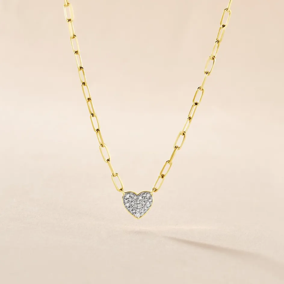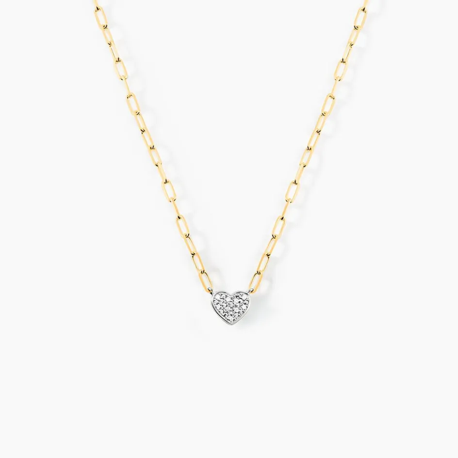 Collier Or Jaune 375/1000 Motif Coeur Diamants 0.0243cts Maille Cheval 40+2cm