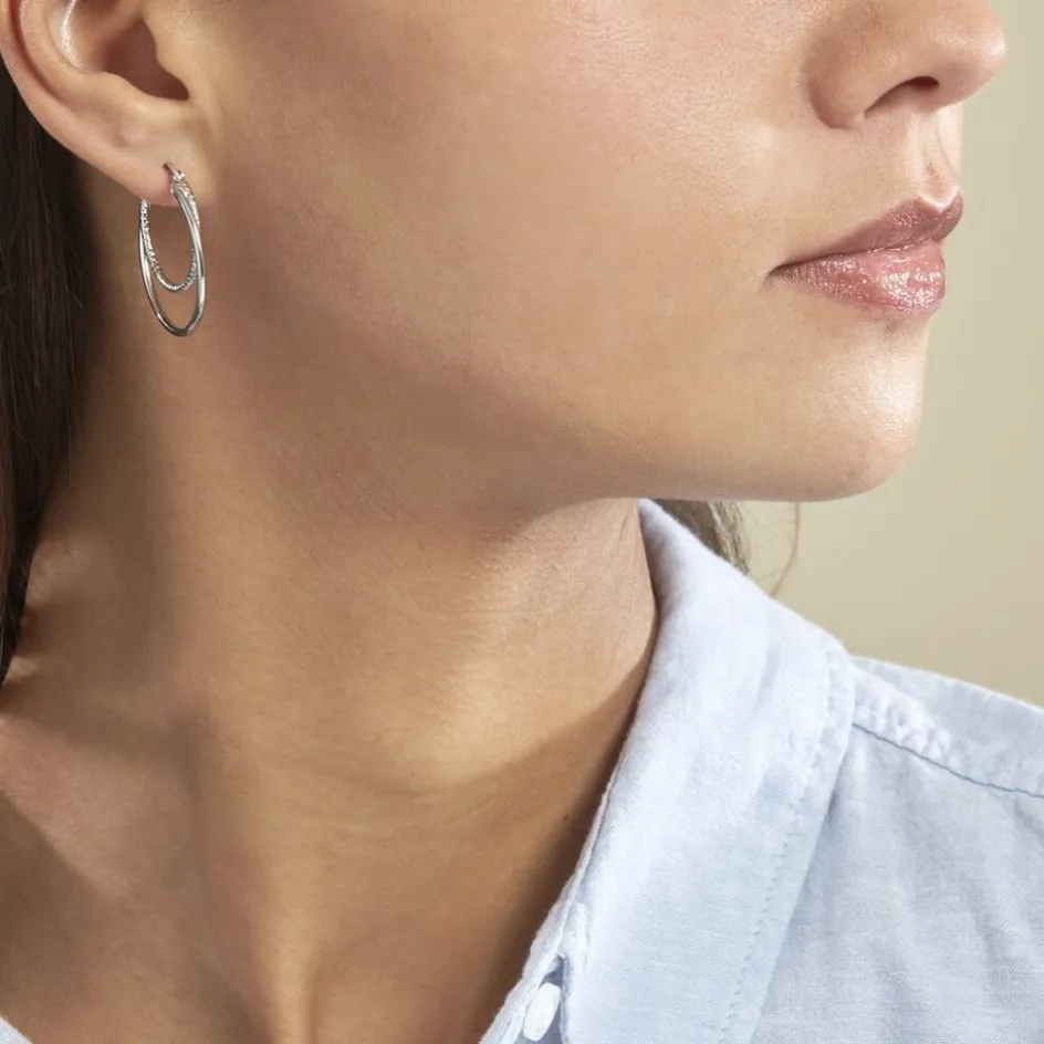 Créoles Argent Blanc 925/1000 Double Fil 1 Lisse 1 Diamante Largeur 1.5mm Diametre 20mm