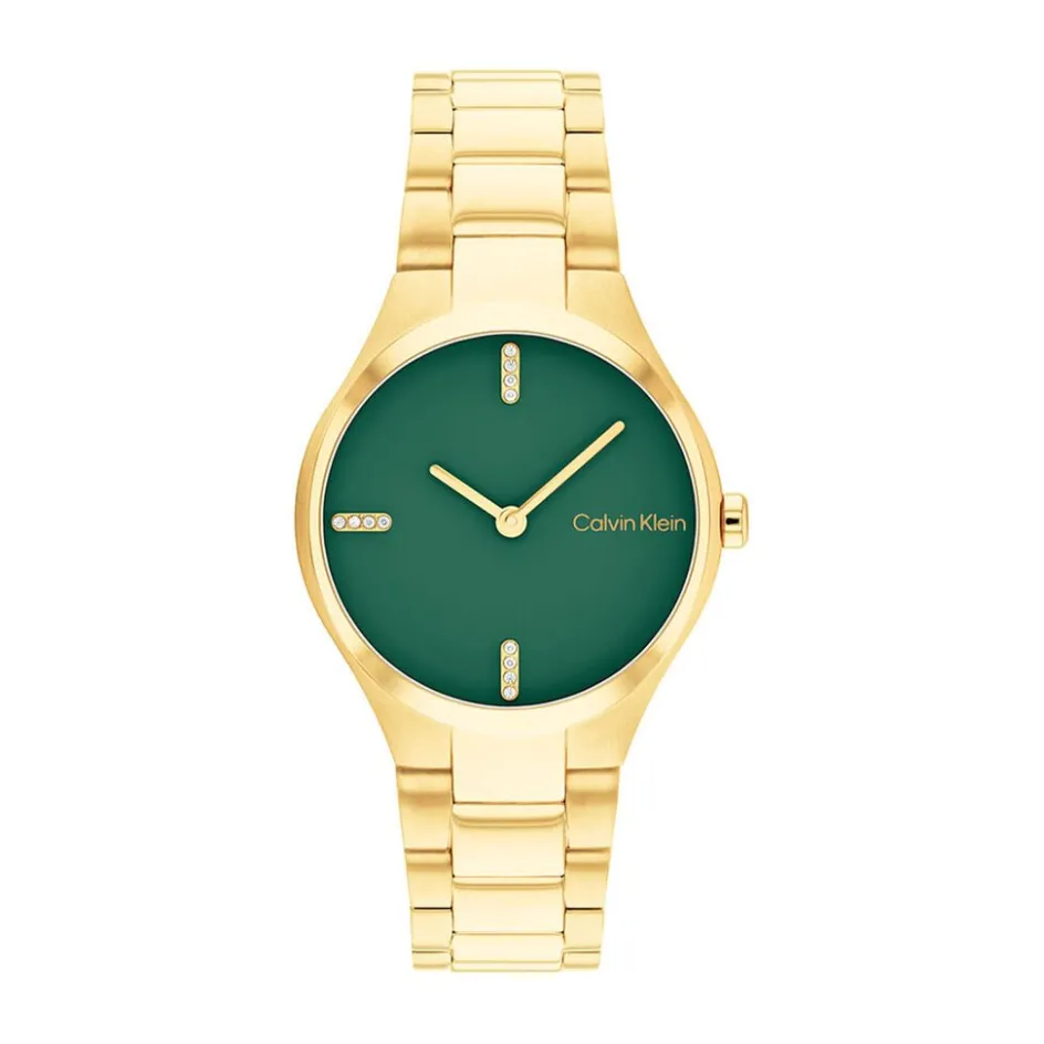 Montre Calvin Klein Admire Boitier Acier Dore Rond 30mm Quartz Fond Vert Bracelet Acier Dore 25200333