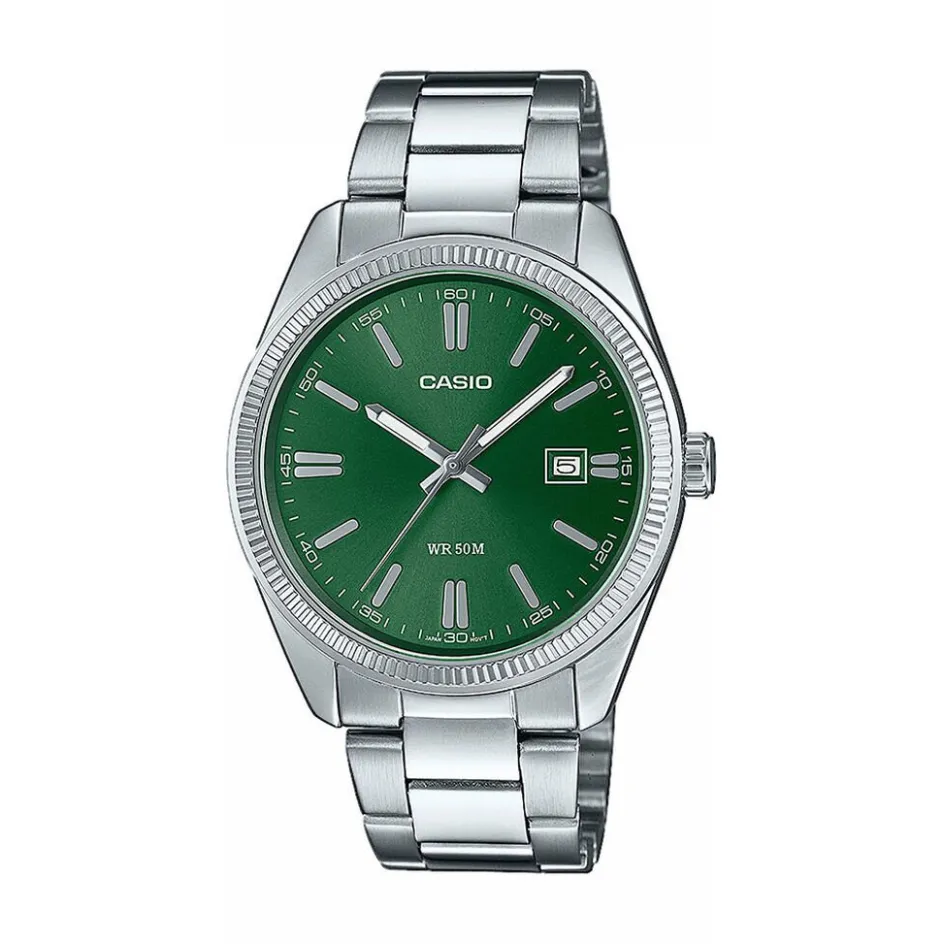 Montre Casio Collection Laiton Argenté Ronde Quartz 44.2mm Fond Vert Bracelet Acier Argenté Mtp-1302pd-3avef