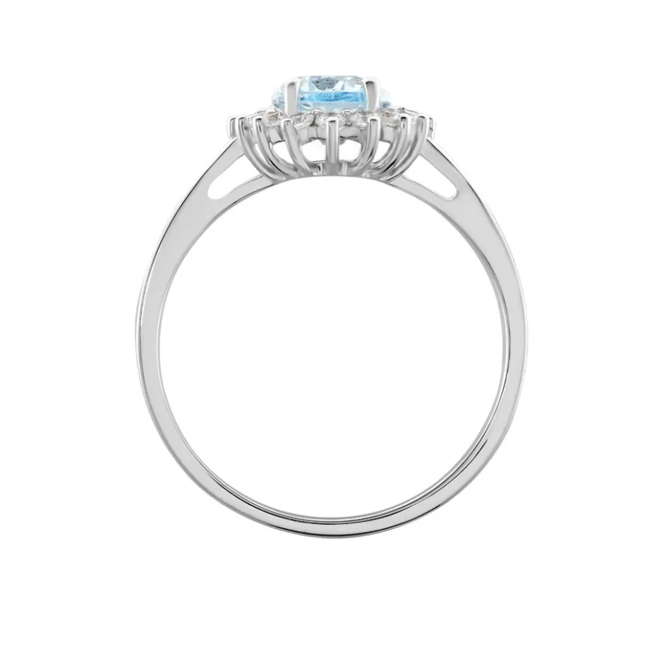 Bague Or Blanc 375/1000 Topaze Sky Blue 1.5 Cts Serti 4 Griffes Entourage Marguerite Oxydes