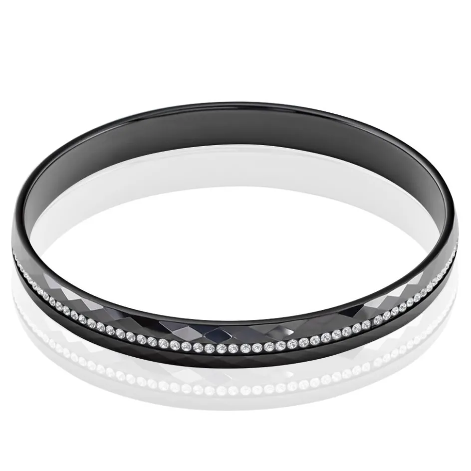 Bracelet Jonc Ceramique Facettee Noire Rang Pierres Blanches 6mm