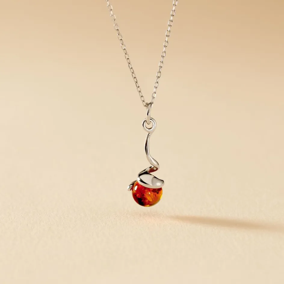 Collier Argent Blanc 925/1000 Ambre Ronde Pendule 45cm