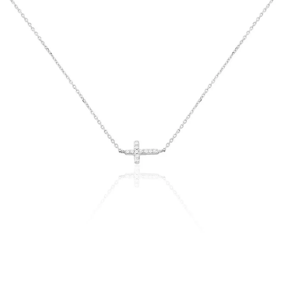 Collier Or Blanc 375/1000 Croix Oxydes De Zirconium Micro Serti Maille Forçat 42cm