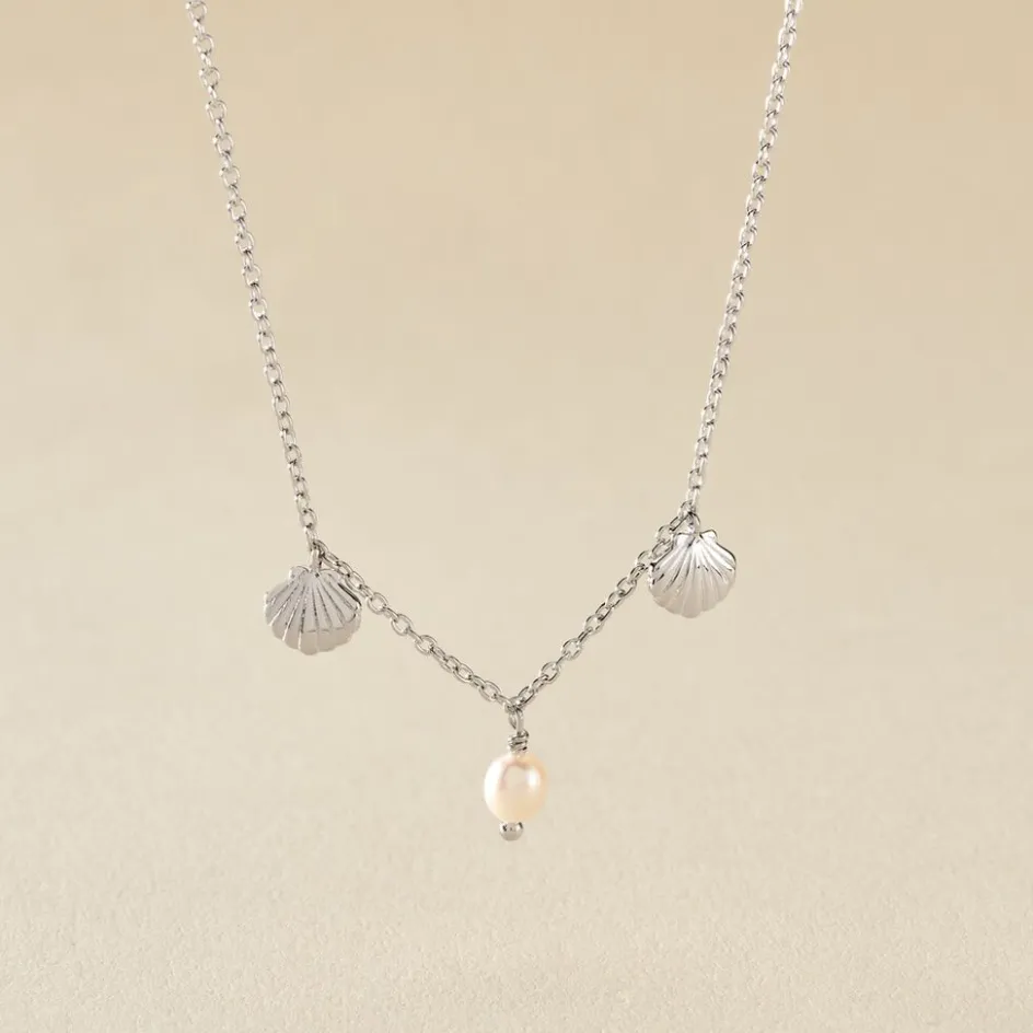 Collier Argent Blanc 925/1000 Pampilles Coquillages Et Perle De Culture Maille Jaseron 42+3cm