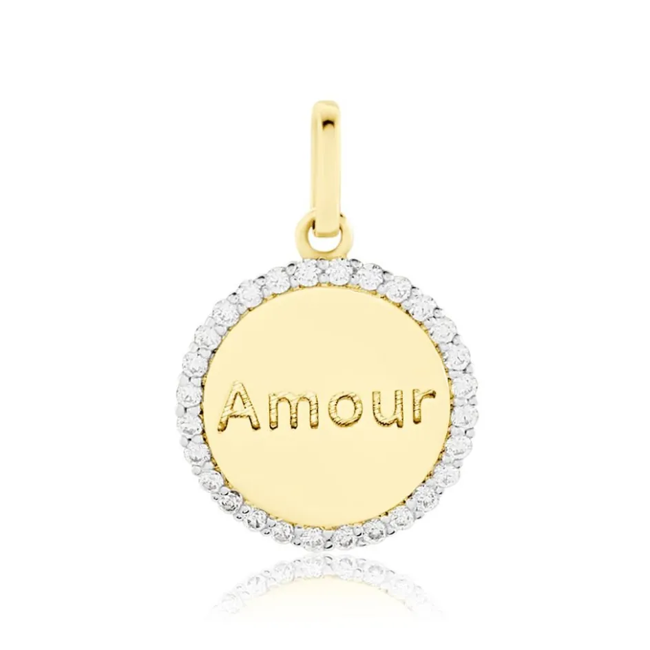 Pendentif Or Jaune 375/100 Plaque Ronde Message Amour Entourage Pavage Oxydes De Zirconium