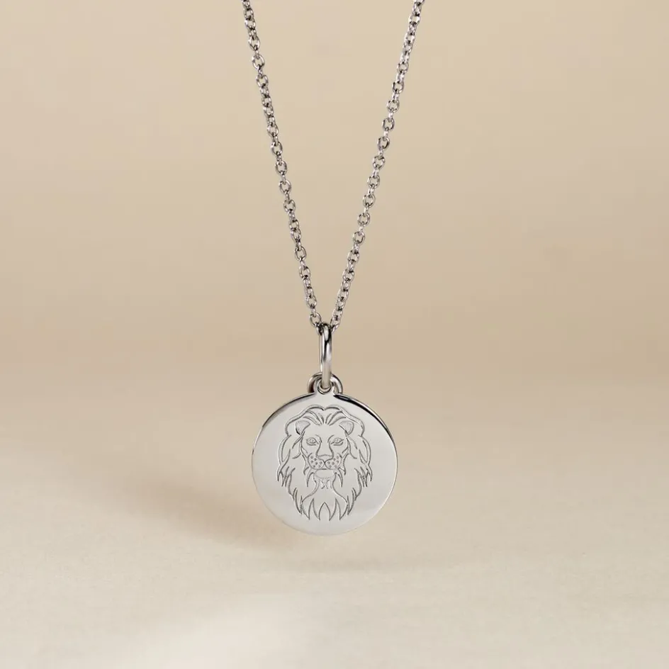 Pendentif Argent Blanc 925/1000 Medaille Ronde Motif Lion