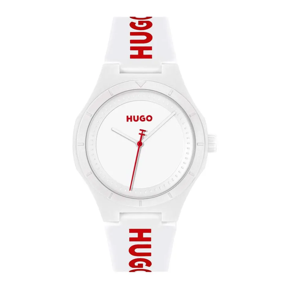 Montre Hugo Litforhim Acier Blanc Ronde Quartz 42mm Fond Blanc Bracelet Silicone Blanc Avec Lettre Rouge 1530345