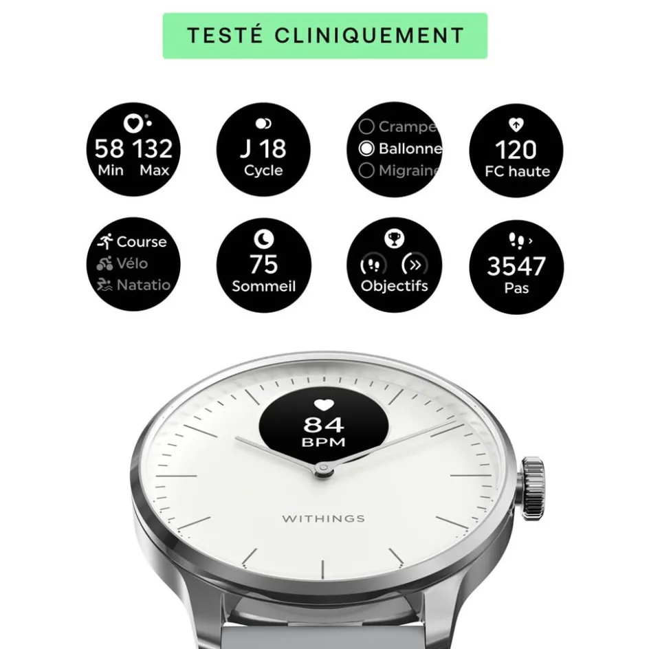 Montre Withings Scanwatch Light Acier Inoxydable Argente Ronde Connectee 37mm Fond Blanc Bracelet Silicone Gris Wswlwhite