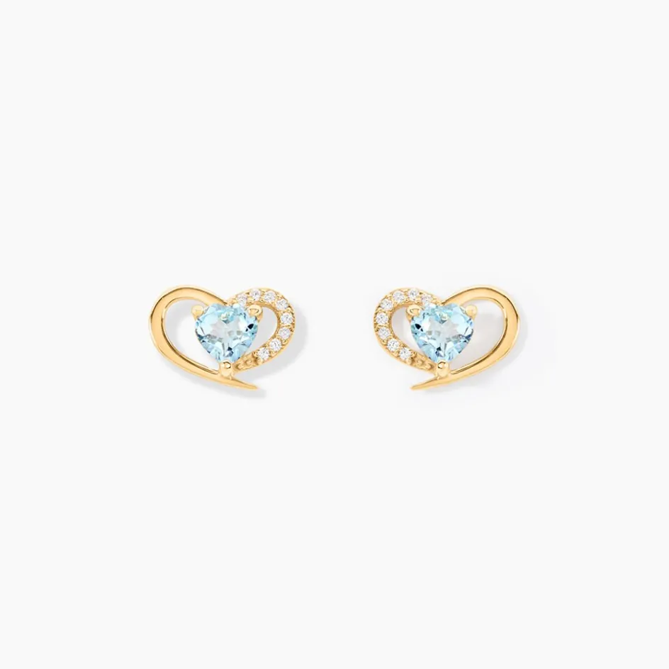 Boucles D’Oreilles Puces Or Jaune 375/1000 C艙ur Topaze Bleu Sky Sertis 3 Griffes Et Pavage Oxyde De Zirconium
