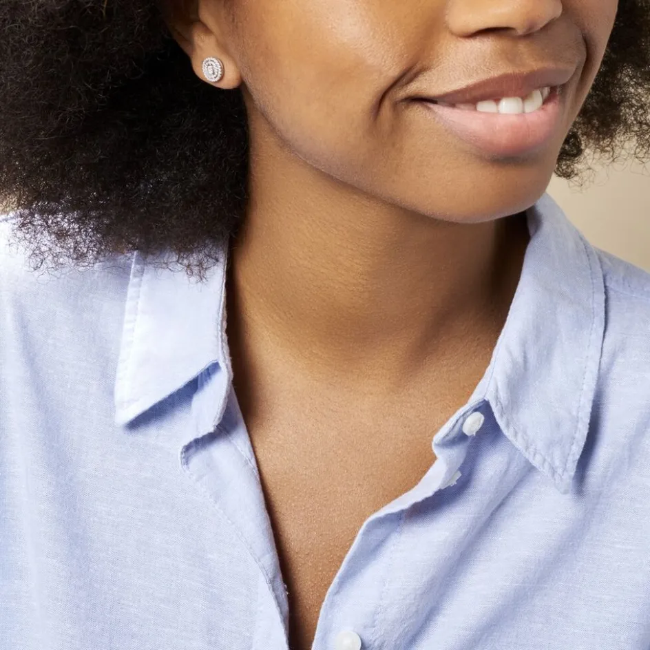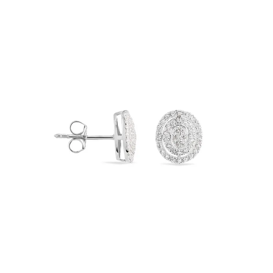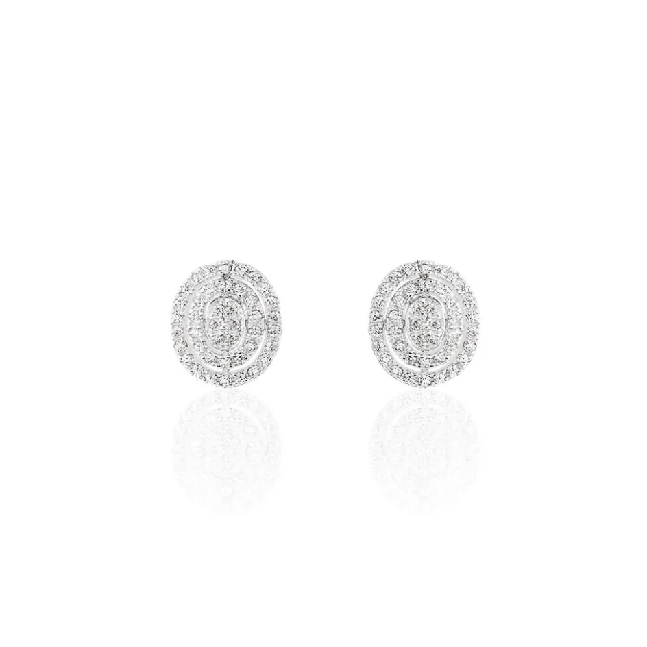Boucles D’oreilles Puces Argent Blanc 925/1000 Entourages Ajoures Formes Ovales Pavage Oxydes De Zirconium