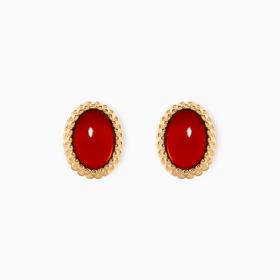 Boucles D’Oreilles Puces Plaqué Or Jaune Cabochons Ovales Pierres Rouges