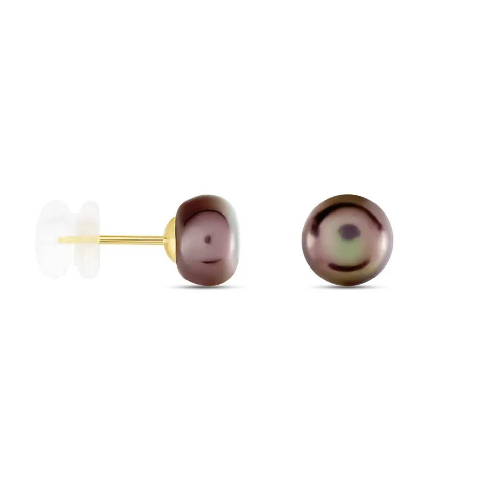 Boucles D’oreilles Or Jaune 375/1000 Perles De Culture Bouton Teintées Noires 7/7.5mm