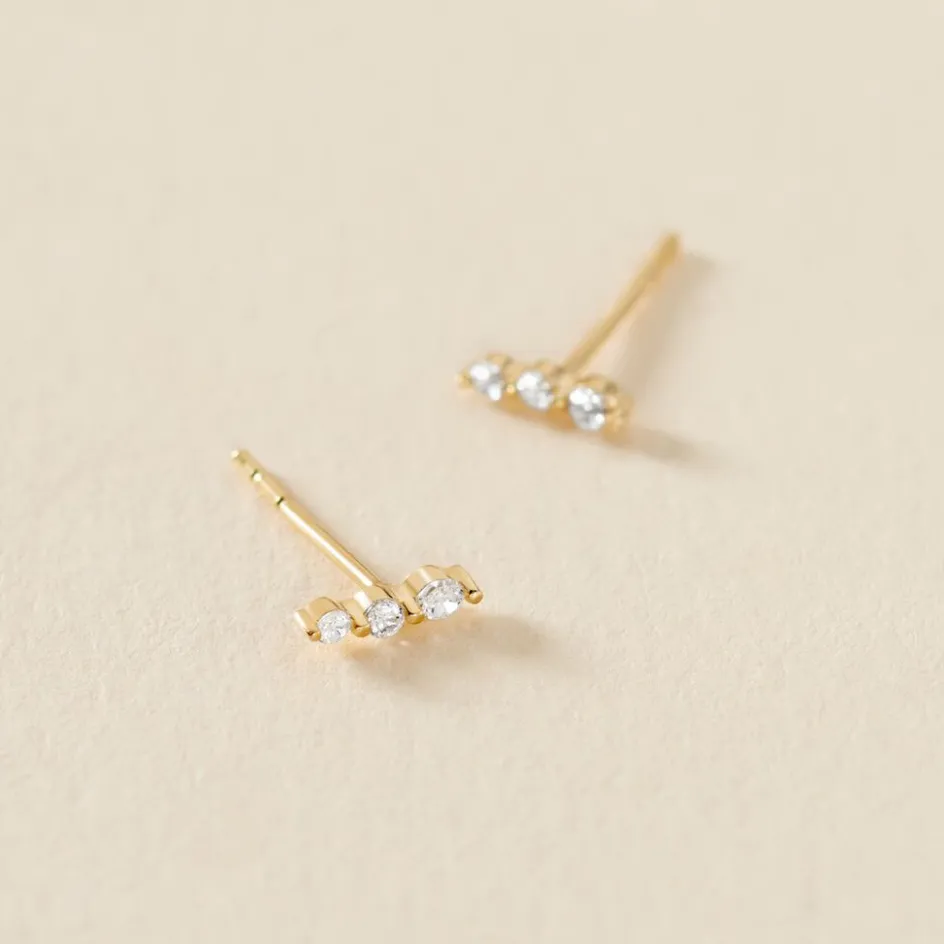 Boucles D’oreilles Puces Or Jaune 375/1000 Barette 3 Oxydes De Zirconium Sertis 2 Griffes
