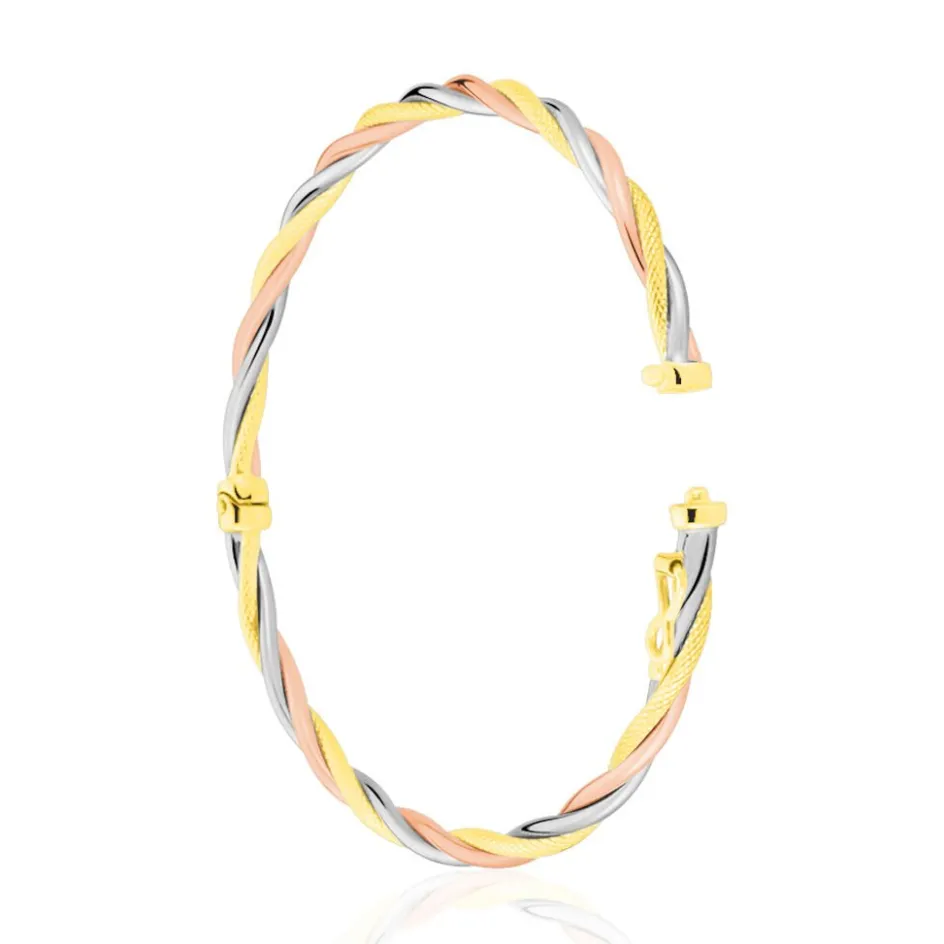Bracelet Jonc Tricolore Or 750/1000 Effet Torsade Fils Lisses Et Diamantes Diametre 65mm