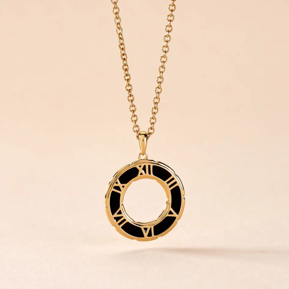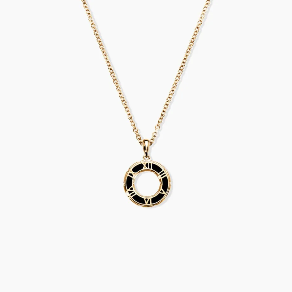Collier Plaqué Or Jaune Cercle Ajouré Chiffres Romains émail Noir Maille Forçat 50cm