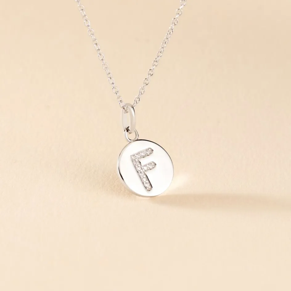 Collier Argent 925/1000 eugenien Pendentif Lettre F Pavage Oxydes De Zirconium Maille Forcat 45cm