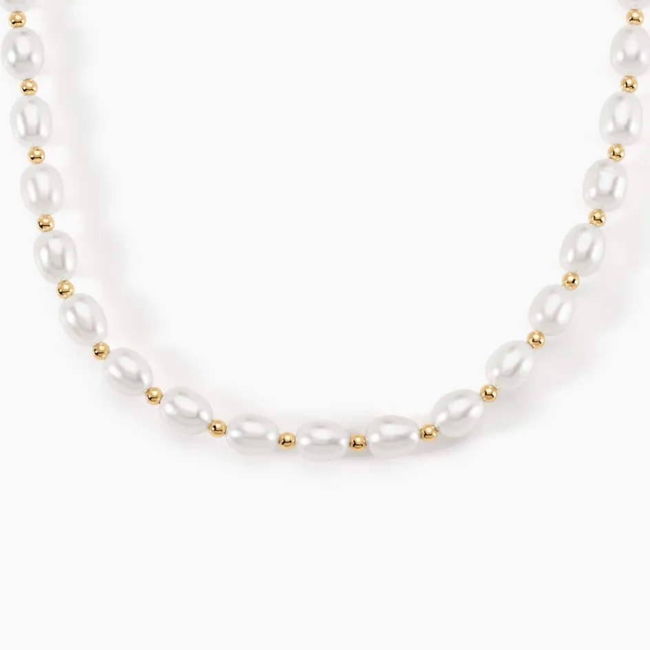 Collier Or Jaune 375/1000 Perles De Culture 5.5/6mm Grain De Riz + Boules Or 42cm