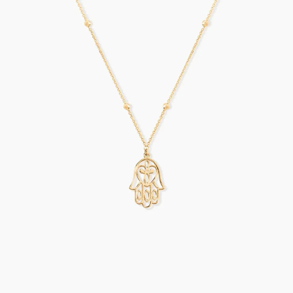 Collier Or Jaune 375/1000 Motif Main De Fatma Ajoure + Petites Boules Sur Chaine Maille Jaseron 42cm