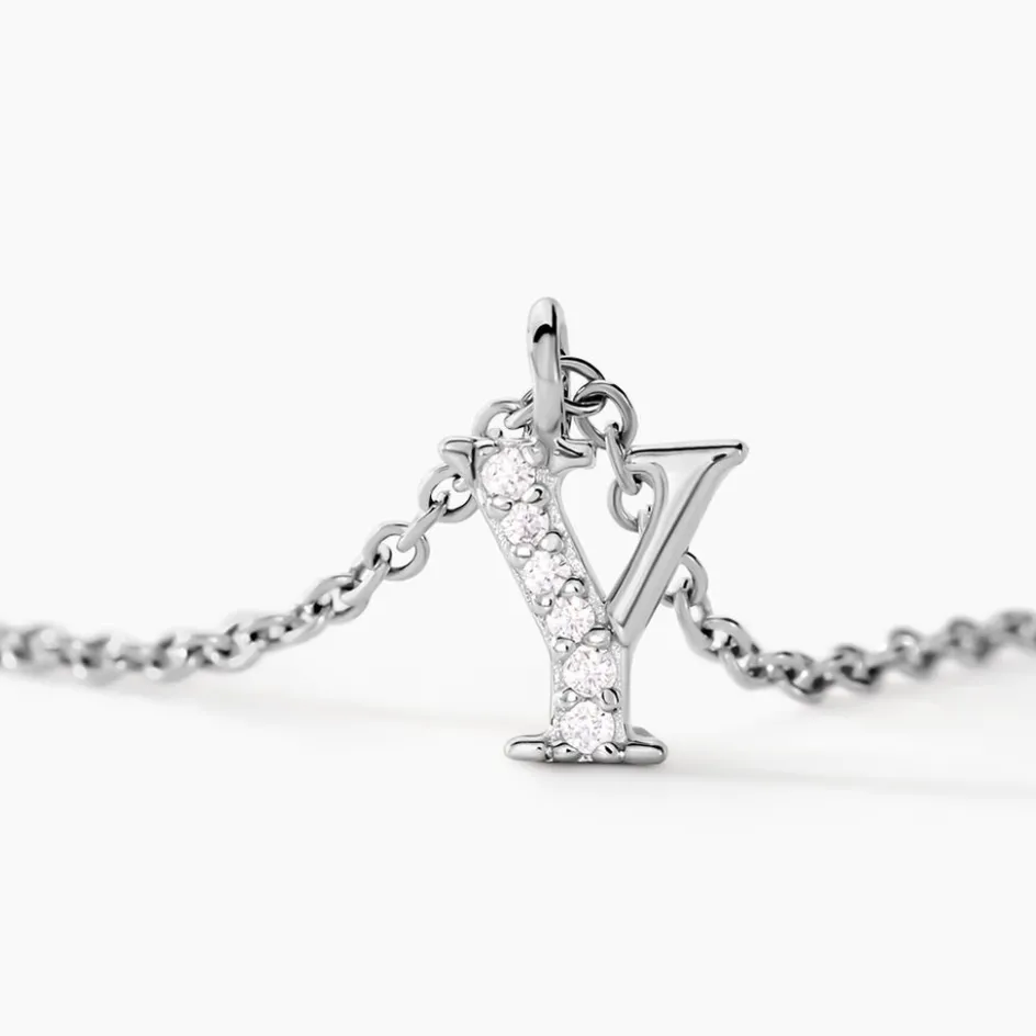 Collier Argent Blanc 925/1000 Lettre Y Semi Pavage Oxydes De Zirconium Maille Forçat 38+3cm