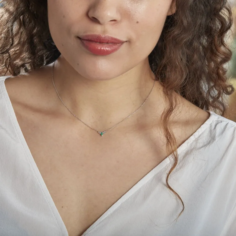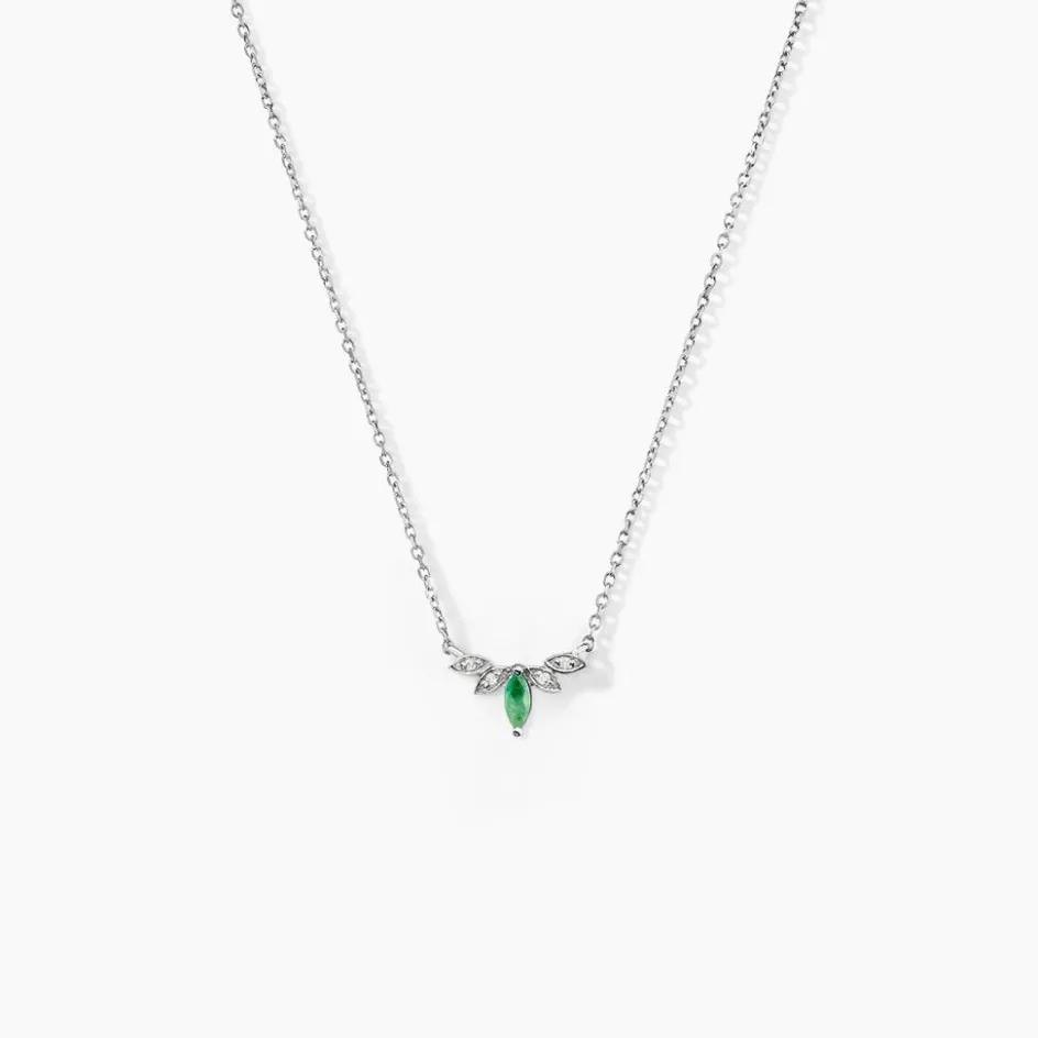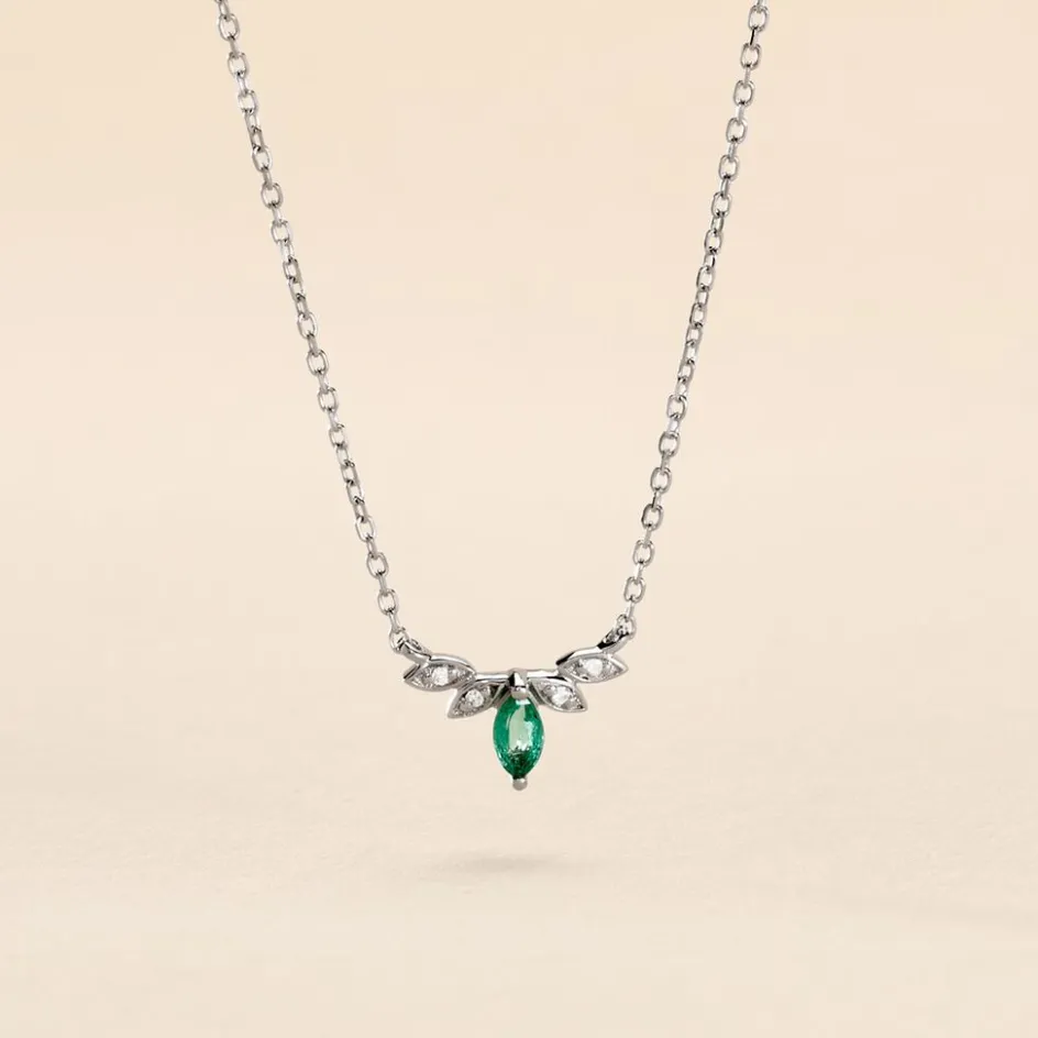 Collier Or Blanc 375/1000 Forme Fleur Emeraude Taille Navette Serti 2 Griffes Accompagne Diamants Maille Forçat 38+4cm