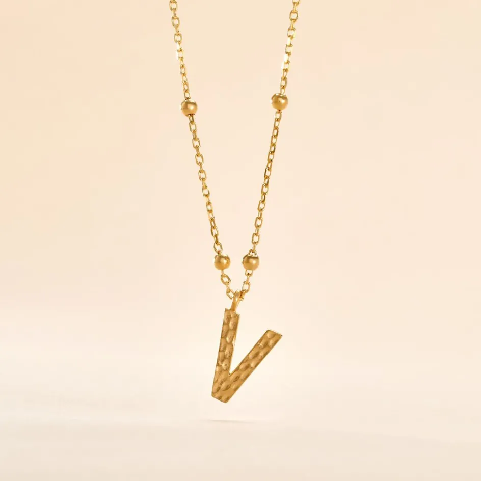 Collier Plaque Or Jaune Lettre V Martelee Et Petites Boules Chaine Maille Forcat Longueur 45cm
