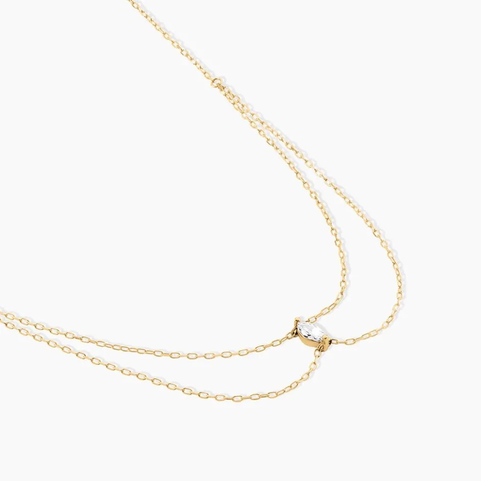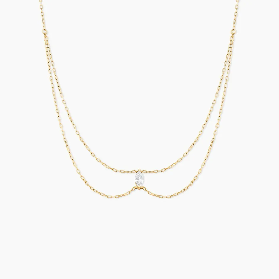 Collier Or Jaune 375/1000 Chocker Double Chaine Solitaire Navette Oxyde De Zirconium Serti Griffes Maille Forcat 35Cm