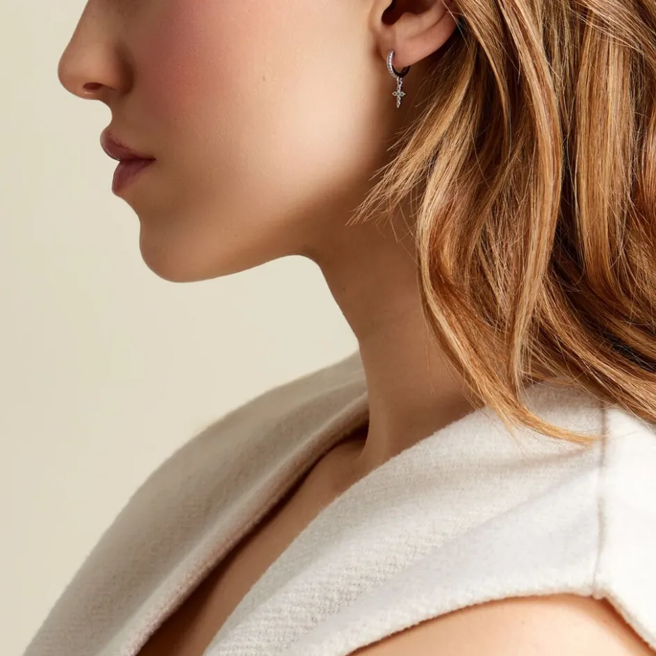 Créoles Argent Blanc 950/1000 Croix Oxydes De Zirconium Serti 4 Griffes Diamètre 10mm