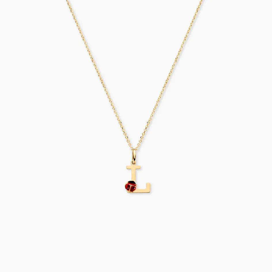 Pendentif Or Jaune 375/1000 Lettre L Motif Coccinelle Email Noir Et Rouge