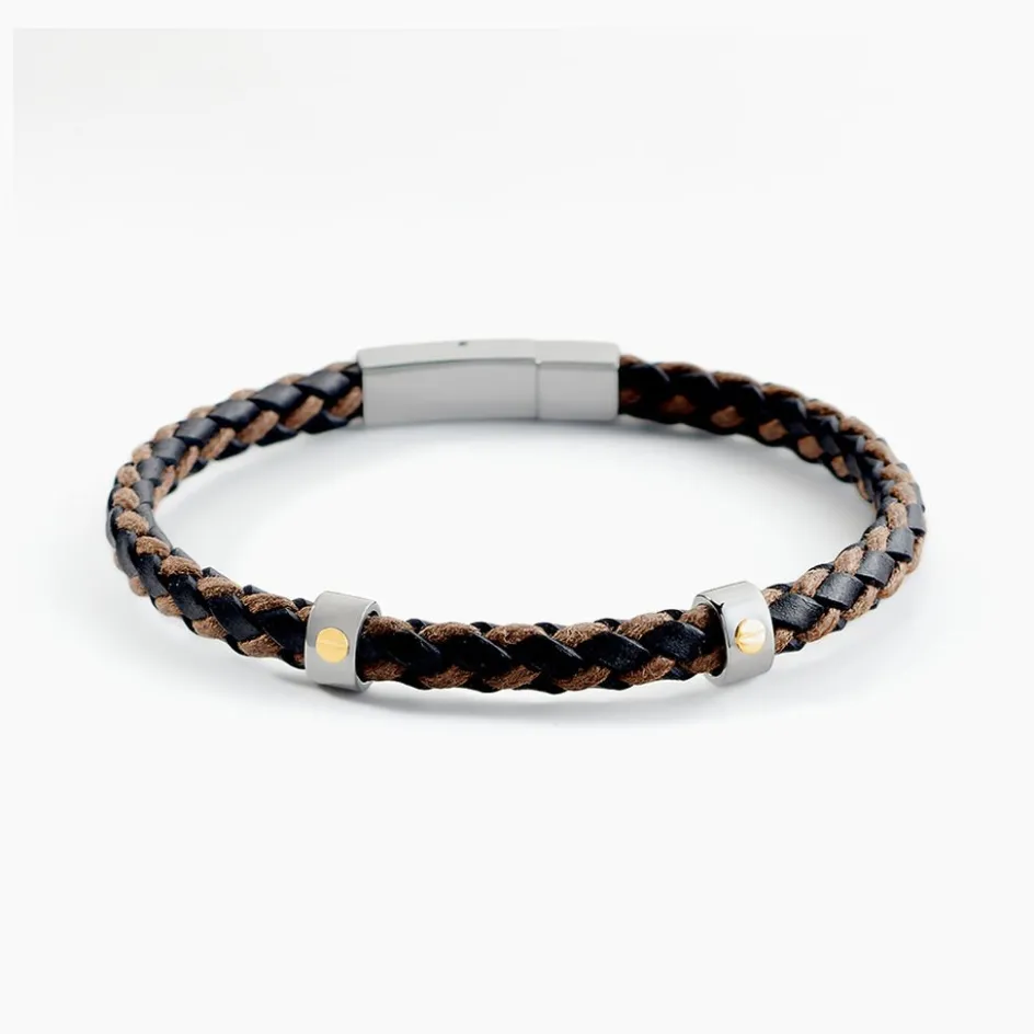 Bracelet Jourdan Dermot Acier Inoxydable Argente Cuir Noir Tresse 19.5cm+2cm Jh300059b