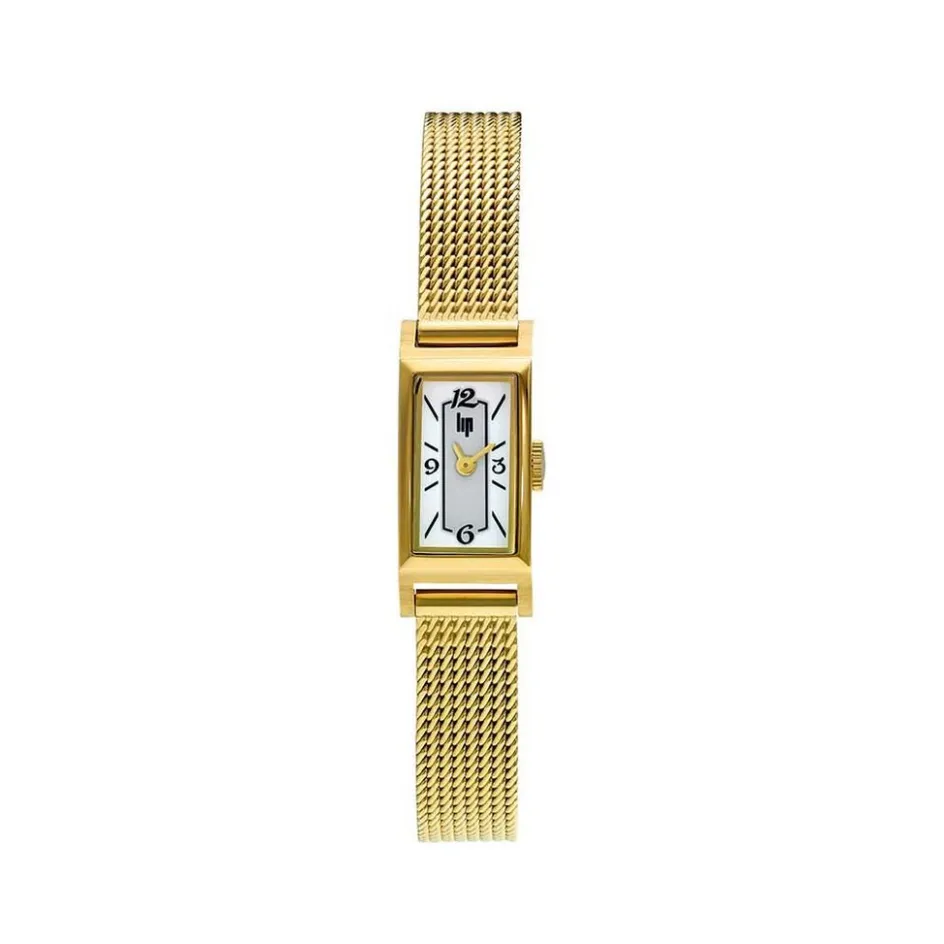Montre Lip Churchill T13 Acier Dore Rectangulaire Quartz 13×29 Mm Fond Blanc Bracelet Acier Dore Maille Milanaise 671226