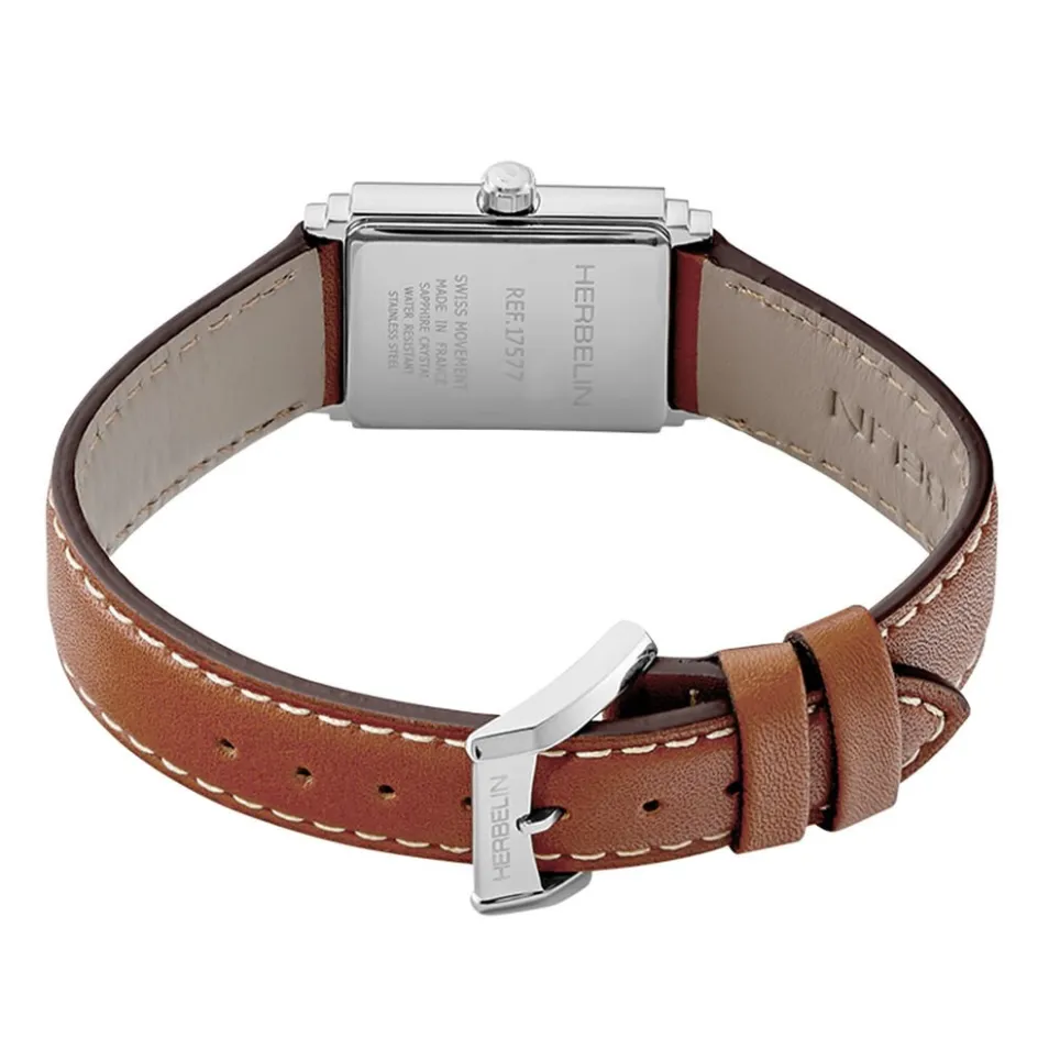 Montre Herbelin Art Deco Acier Argente Rectangulaire Quartz 22×29.5mm Fond Argente Bracelet Cuir De Veau Marron 17577ap22gd