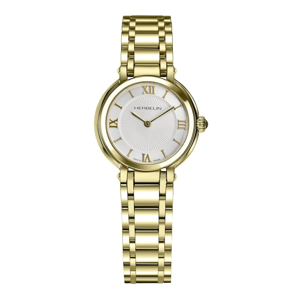 Montre Herbelin Galet Acier Dore Ronde Quartz 28mm Fond Argente Bracelet Acier Dore 17430bp28