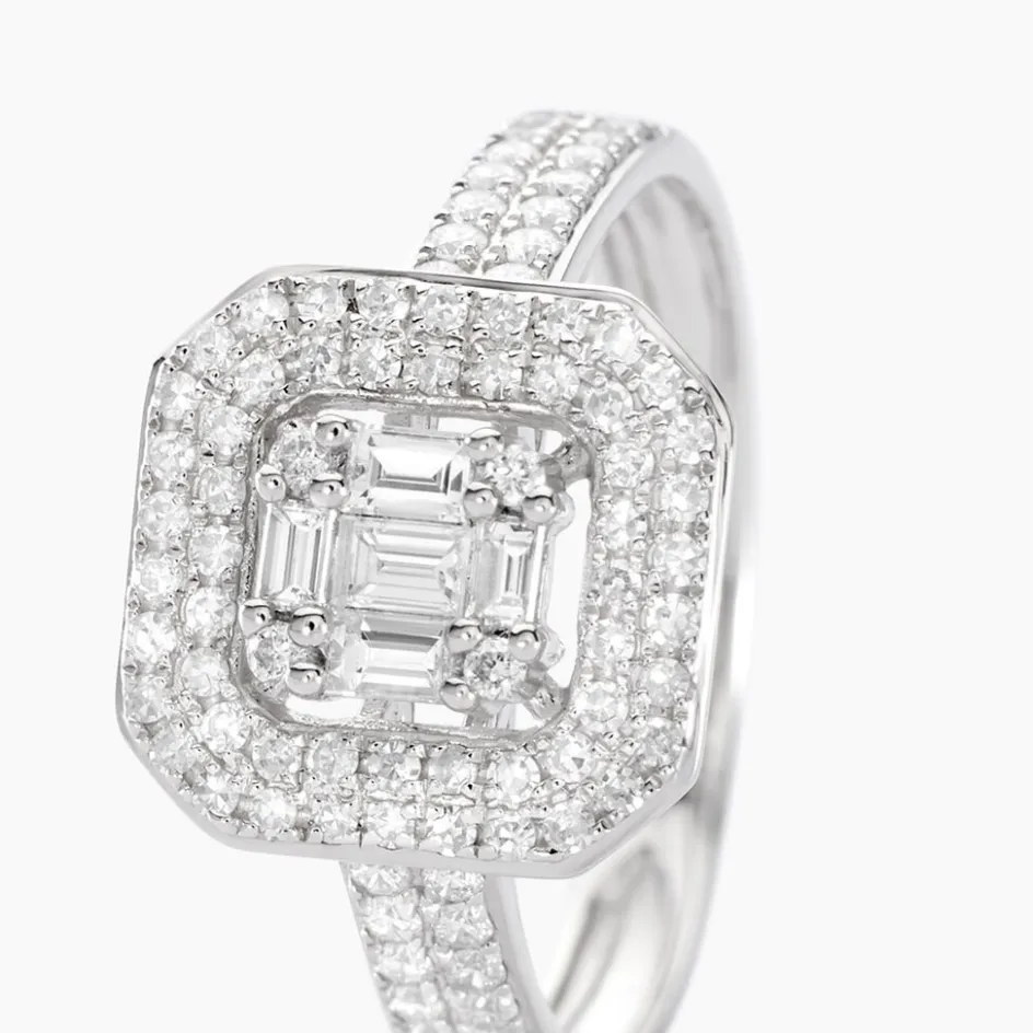 Bague Or Blanc 375/1000 Multipierres Entourage Octogonal Diamants Rectangles 0.12cts Sertis Griffes Et Accompagne