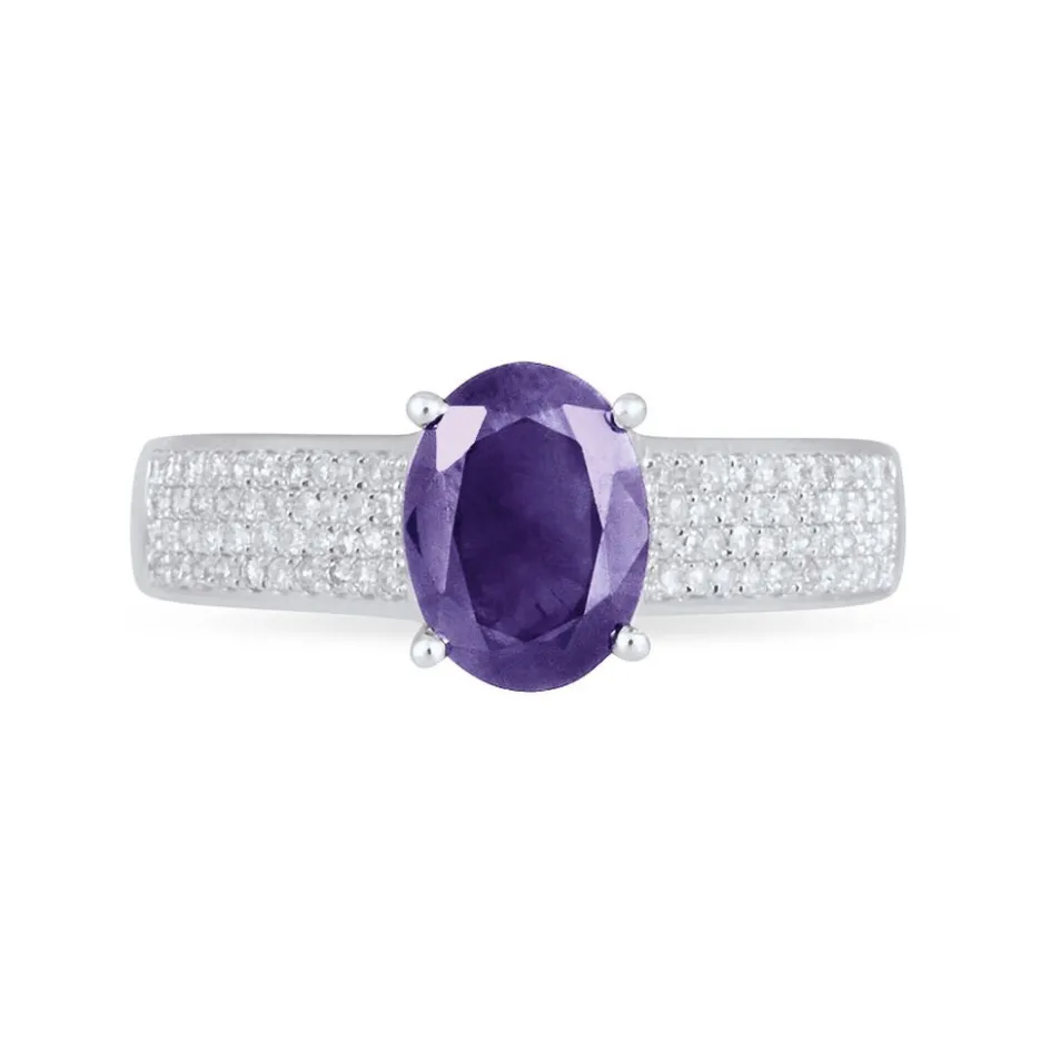 Bague Or Blanc 375/1000 Amethyste Violette Claire Ovale Accompagnee Diamants Pm