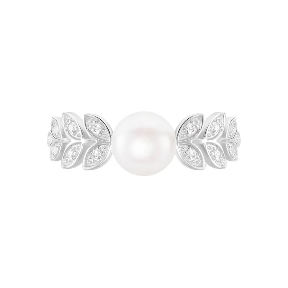 Bague Or Blanc 375/1000 Perle De Culture 7-7.5cm + Motifs Epis Paves Oxydes De Zirconium