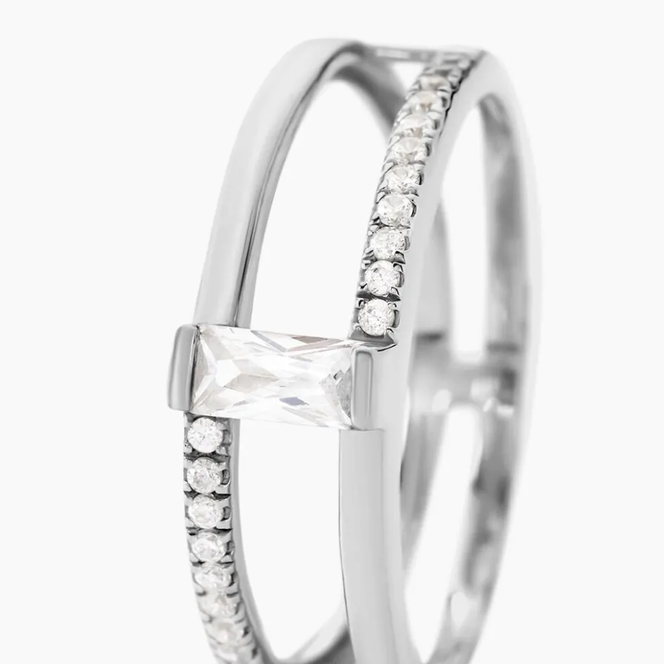 Bague Argent Blanc 925/1000 2 Rangs Ajoures Oxyde De Zirconium Central Taille Emeraude Et Semi Pavage