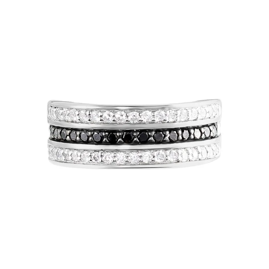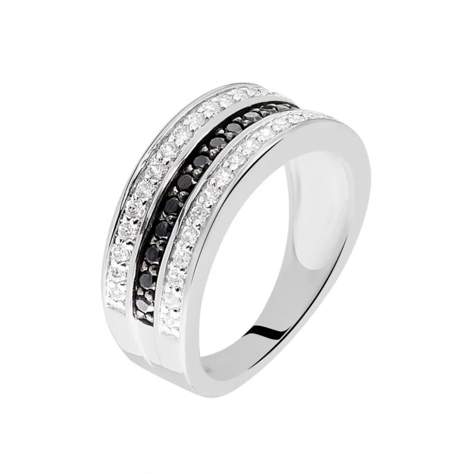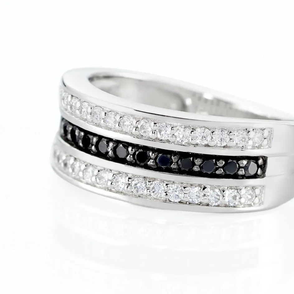 Bague Argent Blanc 925/1000 1 Rang Oxydes De Zirconium Noirs Et 2 Rangs Oxydes De Zirconium Blancs
