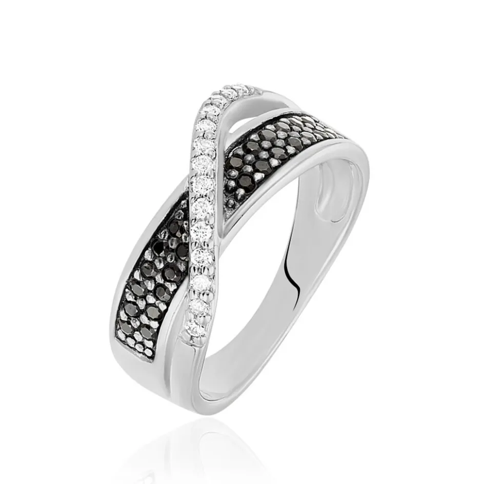 Bague Argent Blanc 925/1000 2 Rangs Oxydes De Zirconium Noirs Et 1 Rang Oxydes De Zirconium Blancs