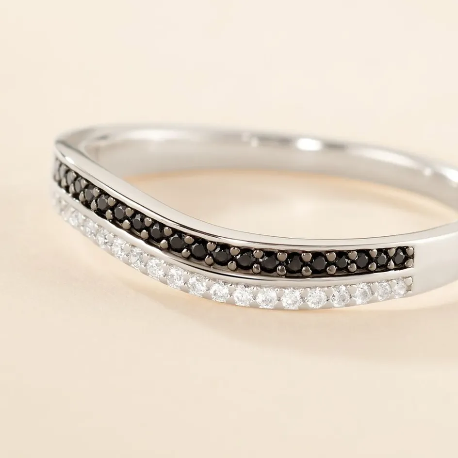 Bague Argent Blanc 925/1000 Forme Vague Pavage Oxydes De Zirconium