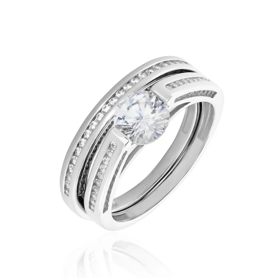 Bague Argent Blanc 925/1000 1 Anneau Oxydes De Zirconium Sertis Rail + 1 Anneau Oxydes De Zirconium