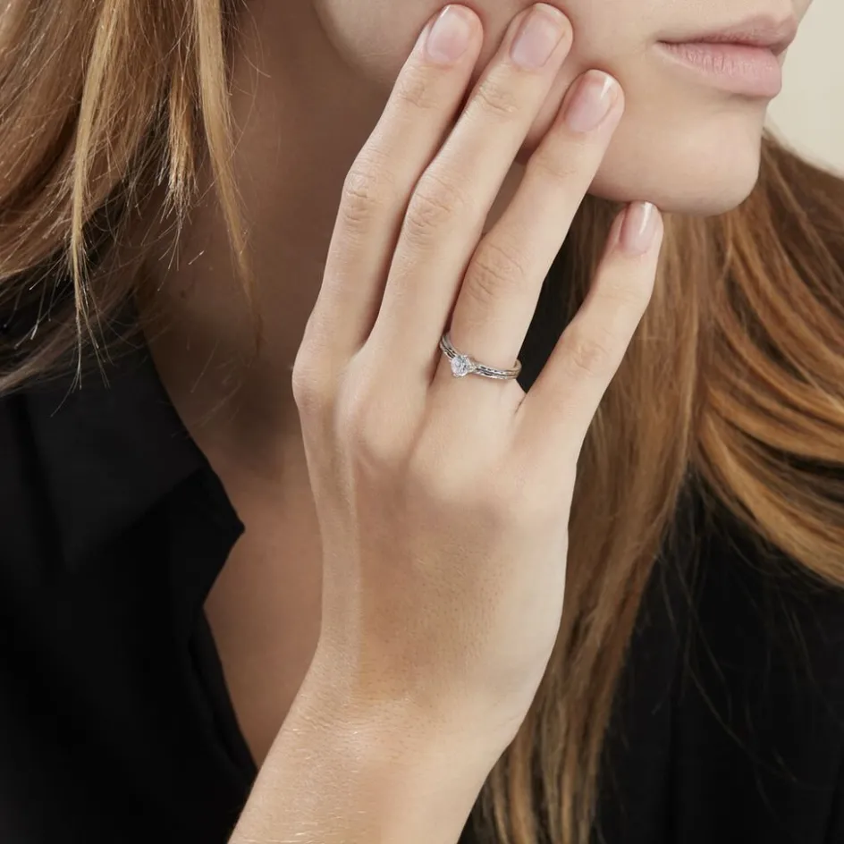 Bague Solitaire Argent Blanc 925/1000 Corps De Bague Martelé Oxyde De Zirconium Serti 4 Griffes 5mm