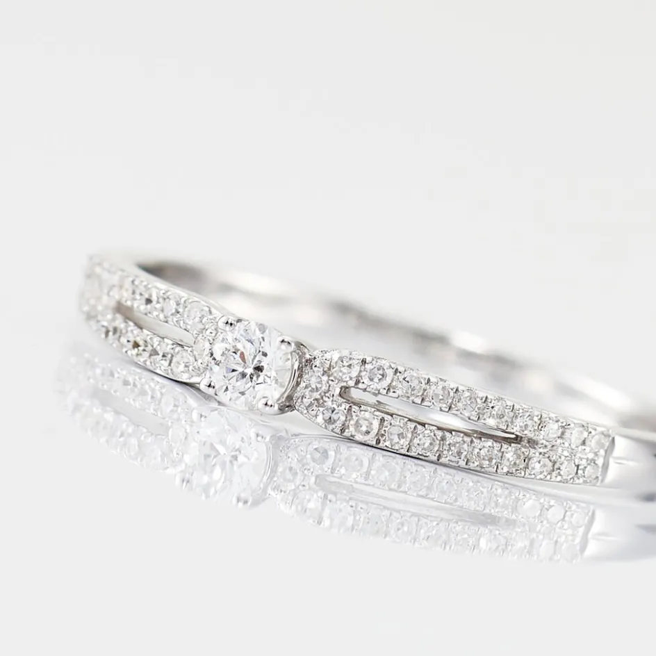 Solitaire Or Blanc 375/1000 Diamant Central 0.10cts Corps De Bague Double Accompagne Diamants