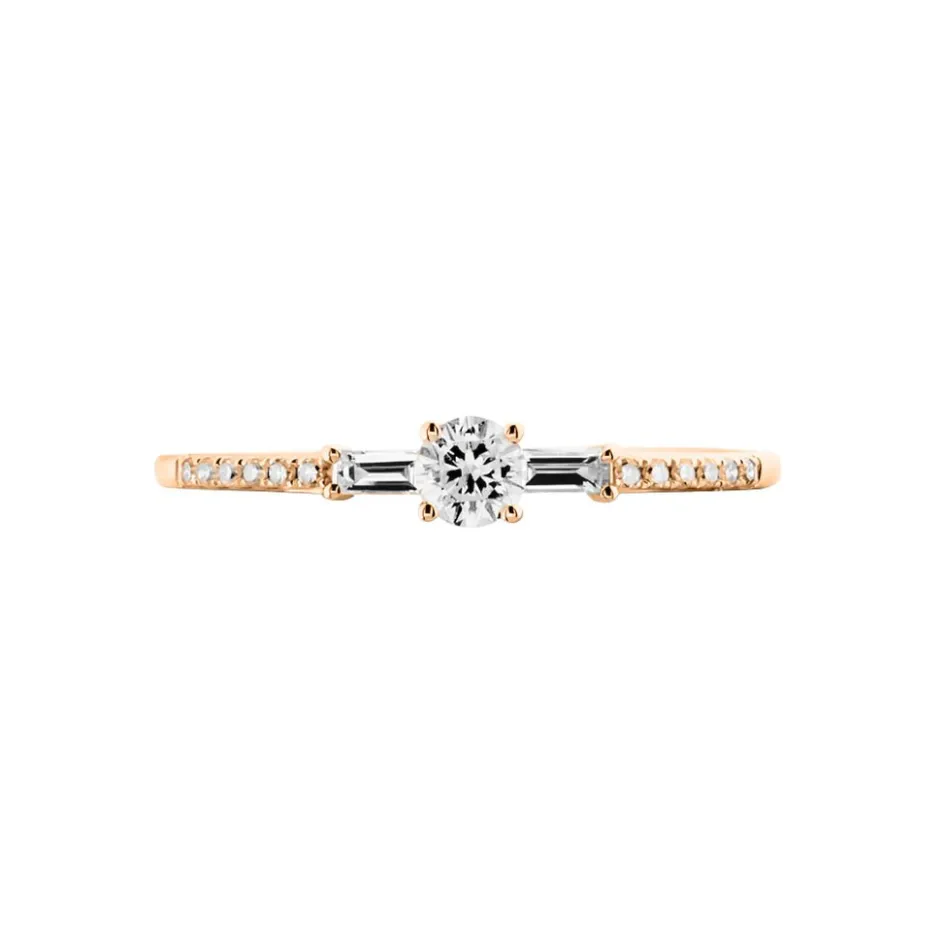 Solitaire Or Rose 750/1000 Diamant Central 0.15cts Accompagne Diamants Baguettes + Pavage Diamants